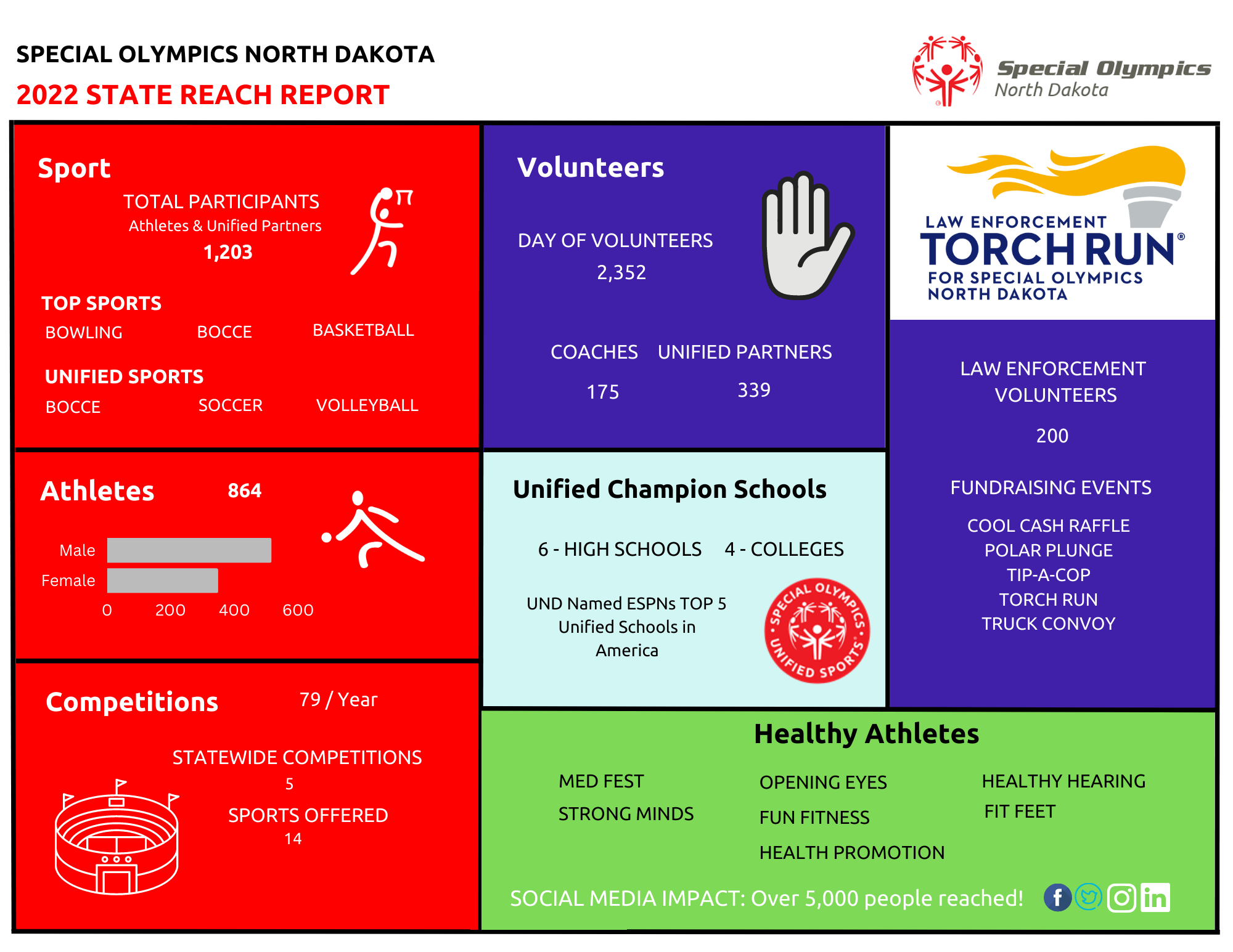 Special Olympics North Dakota is a year-round program, not an annual event. We offer local, area and State-level competitions each year. Please refer to a specific event like “the Special Olympics North Dakota State Basketball Tournament”. When referring to the overall program, say “Special Olympics North Dakota”.